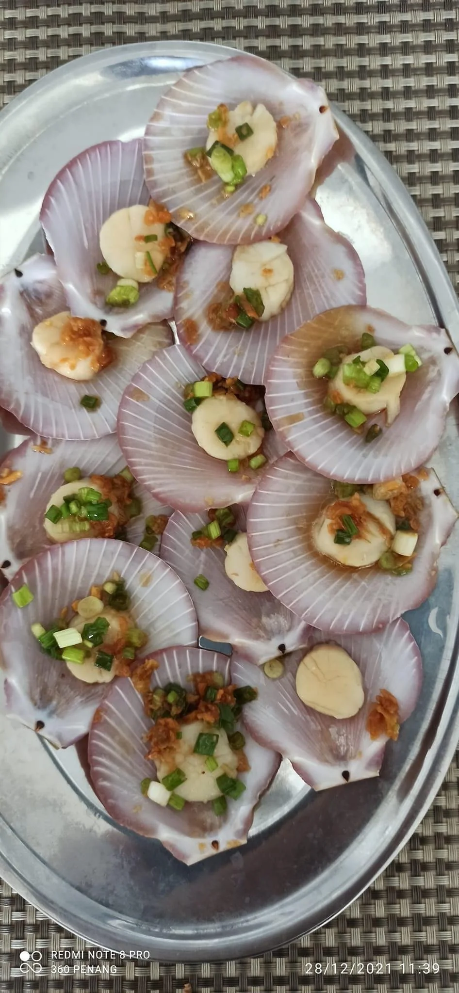 🤠's easy steamed scallops with garlic in oil and spring onions. You will need a dozen scallops on the half shell. I used frozen Indonesian scallops from Lotus supermarket RM22 per bag (a bag has 2-3 dozen half shell scallops).