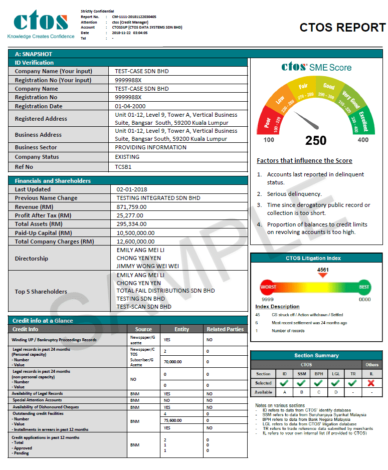 Sample summary page of credit report for Test Case Sdn Bhd showing proprietary CTOS Score