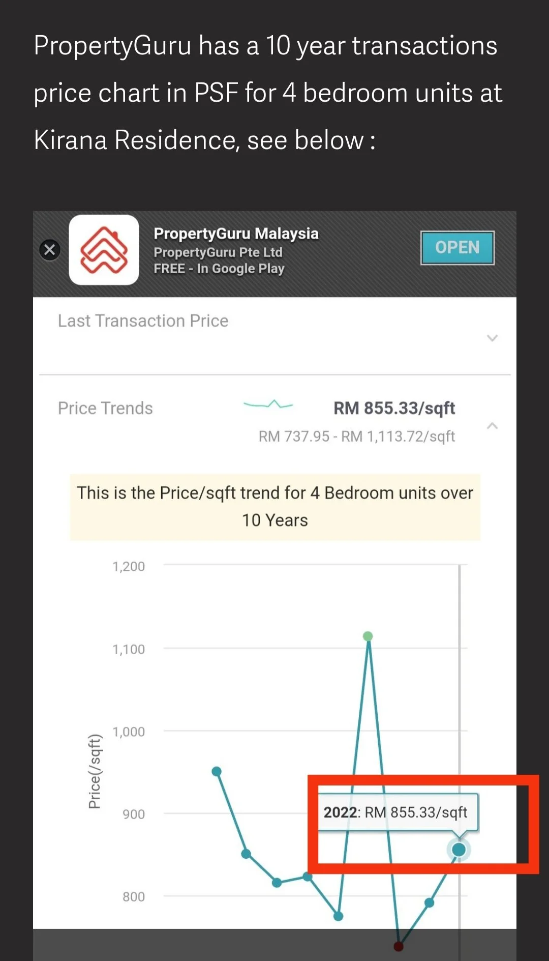 EdgeProp Analytics has a page on Kirana Residence here. And Propertyguru’s Pricing Insights line charts now shows transactions price information in PSF by bedroom size. The line chart for transactions prices in psf for 4 bedroom units at Kirana Residence is shown below.