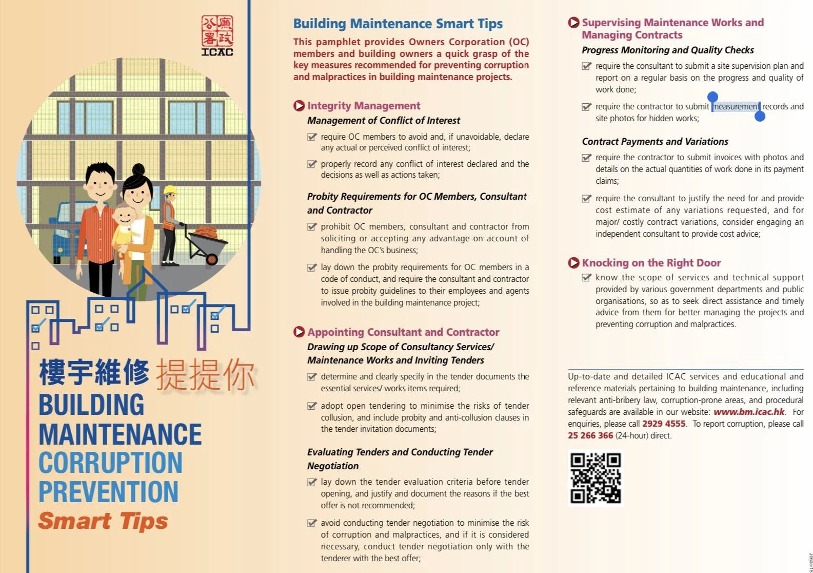 A happy exception was the ICAC of Hong Kong. The Hong Kong Independent Anti Corruption Agency also provides comprehensive “toolkits ” or guidelines on best practices on how to avoid or prevent corruption in property management teams. I find some of the ICAC’s advice on Procurement Practices and Tendering is indeed worthwhile looking at.