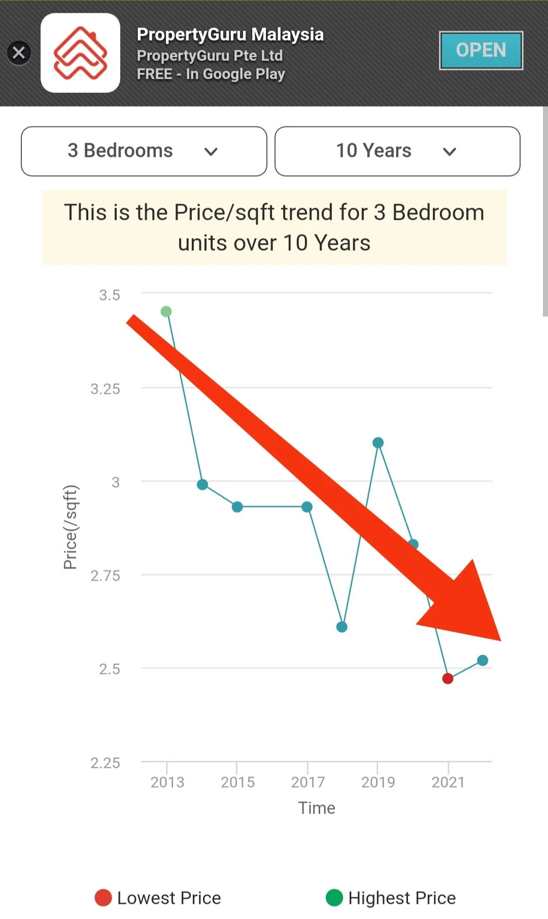 2021 was the worst year for me in over 20+ years as a KLCC landlord. I had to reduce the monthly rent for my 3000+ SF KLCC luxury condo by RM500. In 2022, I am getting more than 10% less in gross rental compared to 2000 when I got the keys to my apartment from the developer, believe it or not. See 10 year chart for rents in PSF for 3 bedroom units at Kirana Residence below. Source: PropertyGuru's Pricing Insights